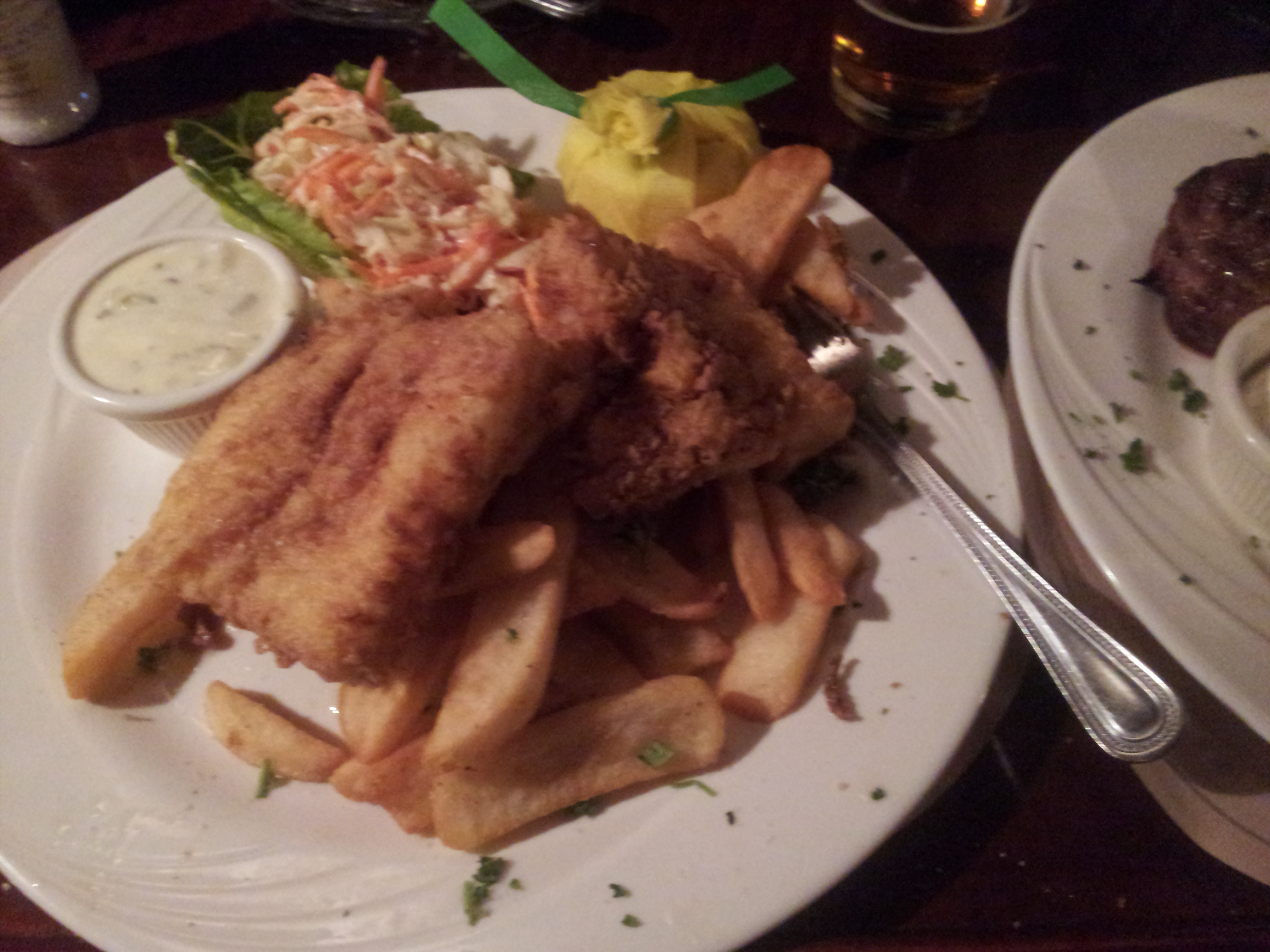 The Big Dog ordered fish and chips, shown above, and said it was an excellent rendition, with perfect chunky cole slaw in a clever romaine bowl, and really good fish. Very fresh and very delicious, with a light batter. Those big flat fries are rarely any good, and the Dog would likely order something else next time to avoid them.