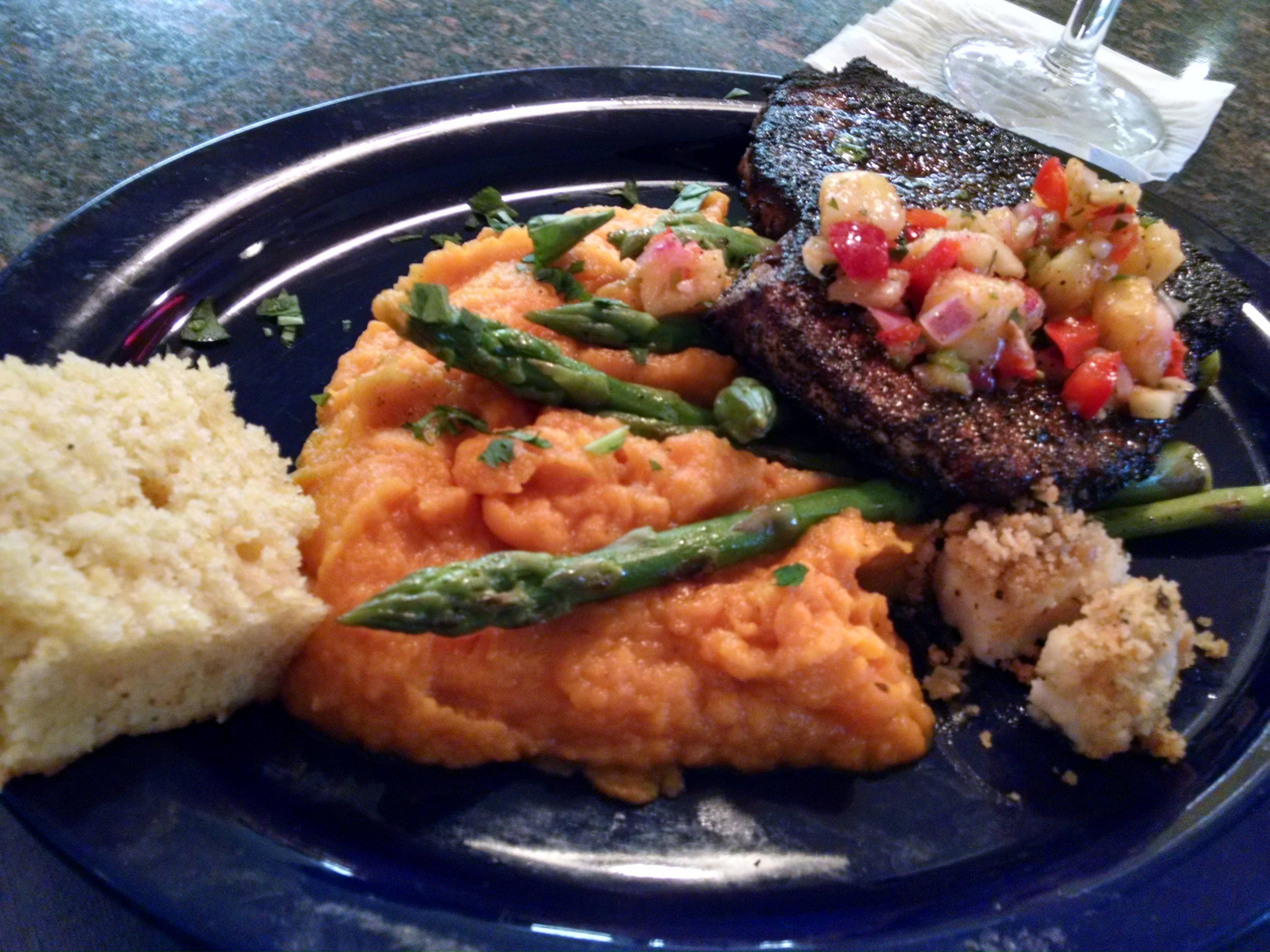 The Big Dog knew going into it that he wasn’t going to like the pineapple salsa atop the pan blackened swordfish, so he scooped it off and enjoyed the dish without it. The balance included mashed sweet potatoes and delicious asparagus.