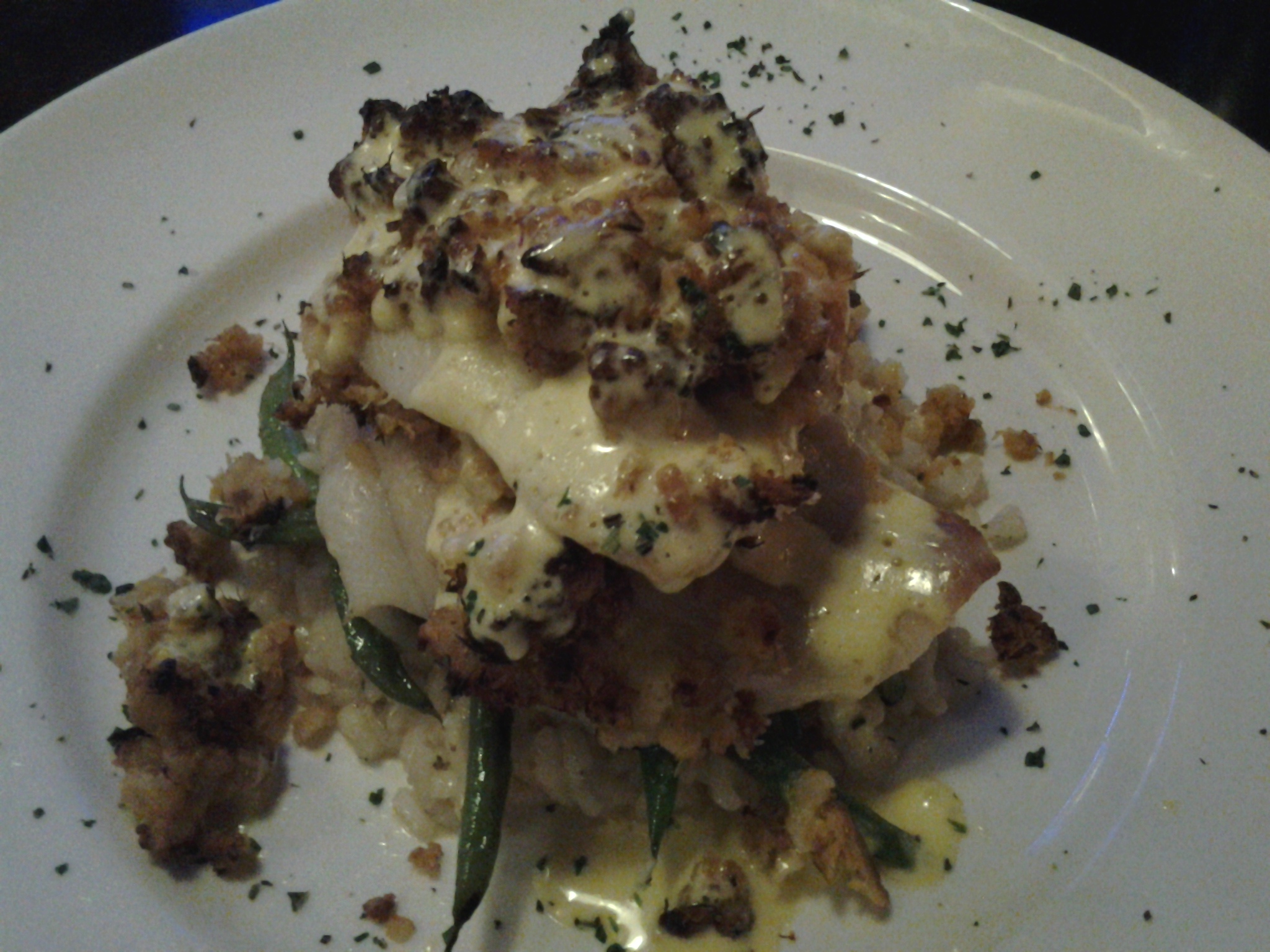 Gina made the best entree choice of the night, selecting roasted sole ($18) and scarfing it down before the rest of the party had a chance to get a good look at it. The sole was layered with crab meat and linguica atop risotto with green beans. The stack was topped with hearty crumbs and a light lemony hollandaise sauce, a delicious combination. (Note to dining companions: See photo above.)