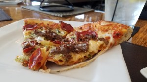 The Big Dog ordered the “Chubby Sicilian” pizza ($19 for a “full size”). We’re not sure how big the pizza was, but it was so loaded up that it could likely feed four. Toppings included house-made sweet Italian sausage, sliced meatballs, pepperoni, spinach-ricotta, marinara sauce, and mozzarella over baked penne pasta. On a pizza. This is one pizza. With penne. It was really good for lunch, and excellent the next morning reheated for breakfast.